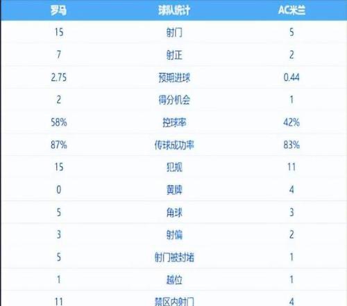 羅馬隊(duì)在多項(xiàng)數(shù)據(jù)上占據(jù)優(yōu)勢(shì),他們的射門次數(shù)為15次,射正7次,而AC米蘭這兩項(xiàng)數(shù)據(jù)分別為5次和2次,羅馬隊(duì)的控球率接近六成,并獲得5個(gè)角球。